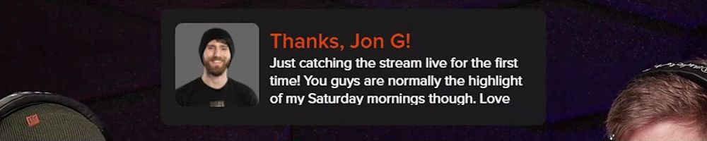 Thanks, Jon G! Just catching the stream live for the first time! You guys are normally the highlight of my Saturday mornings though. Love