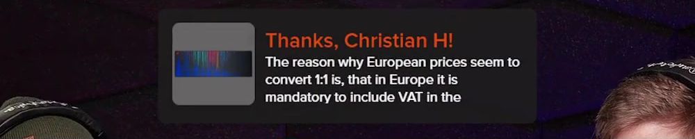 Thanks, Christian H! The reason why European prices seem to convert 1:1 is, that in Europe it is mandatory to include VAT in the