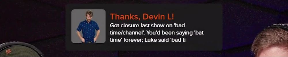 Thanks, Devin L! Got closure last show on 'bad time/channel'. You'd been saying "bat time" forever; Luke said 'bad ti