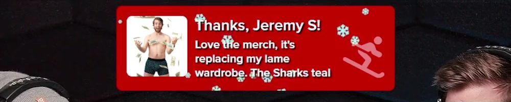 Thanks, Jeremy S! Love the merch, it's replacing my lame wardrobe. The Sharks teal