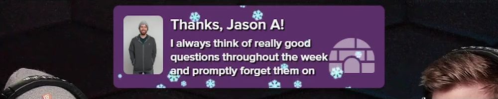 Thanks, Jason A! I always think of really good questions throughout the week and promptly forget them on
