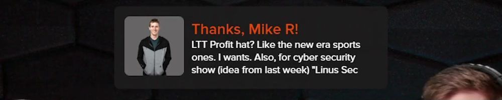 LTT Profit hat? Like the new era sports ones. I wants. Also, for cyber security show (idea from last week) "Linus Sec