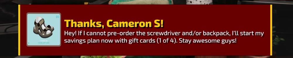 Hey! If I cannot pre-order the screwdriver and/or backpack, I'll start my savings plan now with gift cards (1 of 4). Stay awesome guys!