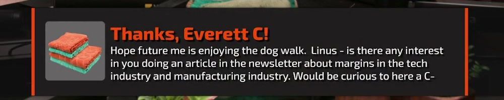 Hope future me is enjoying the dog walk. Linus - is there any interest in you doing an article in the newsletter about margins in the tech industry and manufacturing industry. Would be curious to here a C-
