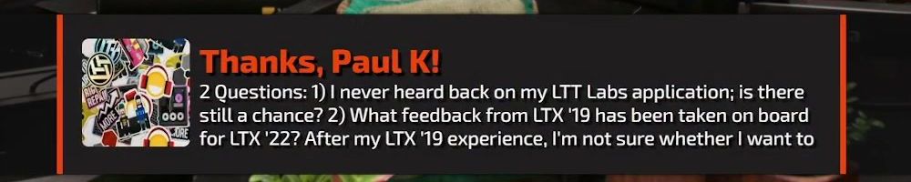 2 Questions: 1) I never heard back on my LTT Labs application; is there still a chance? 2) What feedback from LTX '19 has been taken on board for LTX '22? After my LTX '19 experience, I'm not sure whether I want to