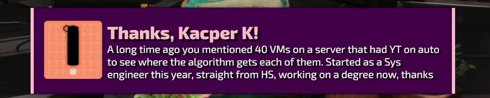 A long time ago you mentioned 40 VMs on a server that had YT on auto to see where the algorithm gets each of them. Started as a Sys engineer this year, straight from HS, working on a degree now, thanks
