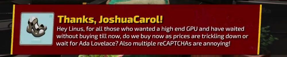 Hey Linus, for all those who wanted a high end GPU and have waited without buying till now, do we buy now as prices are trickling down or wait for Ada Lovelace? Also multiple reCAPTCHAs are annoying!
