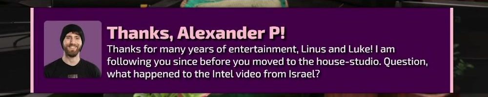 Thanks for many years of entertainment, Linus and Luke! I am following you since before you moved to the house-studio. Question, what happened to the Intel video from Israel?
