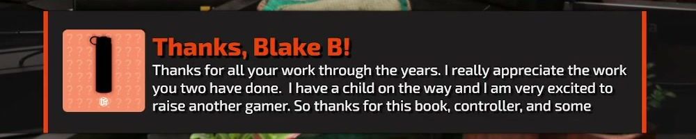 Thanks for all your work through the years. I really appreciate the work you two have done. I have a child on the way and I am very excited to raise another gamer. So thanks for this book, controller, and some