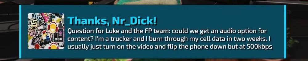 Question for Luke and the FP team: could we get an audio option for content? I'm a trucker and I burn through my cell data in two weeks. I usually just turn on the video and flip the phone down but at 500kbps