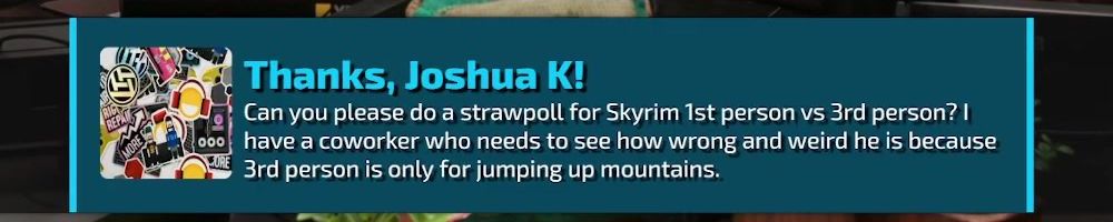 Can you please do a strawpoll for Skyrim 1st person vs 3rd person? I have a coworker who needs to see how wrong and weird he is because 3rd person is only for jumping up mountains.