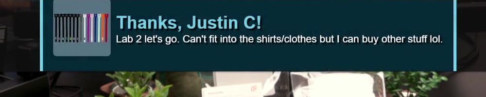 Thanks, Justin C! Lab 2 let's go. Can't fit into the shirts/clothes but I can buy other stuff lol.