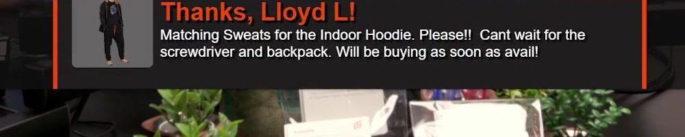 Thanks, Lloyd L! Matching Sweats for the Indoor Hoodie. Please!! Cant wait for the screwdriver and backpack. Will be buying as soon as avail!
