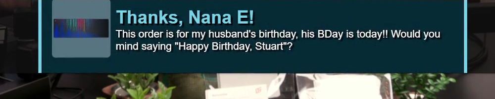 Thanks, Nana E! This order is for my husband's birthday, his BDay is today!! Would you mind saying "Happy Birthday, Stuart"?