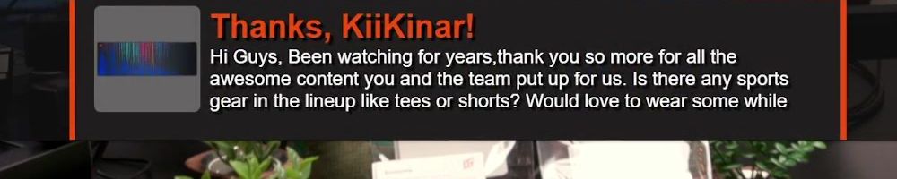 Thanks, KiiKinar! Hi Guys, Been watching for years,thank you so more for all the awesome content you and the team put up for us. Is there any sports gear in the lineup like tees or shorts? Would love to wear some while