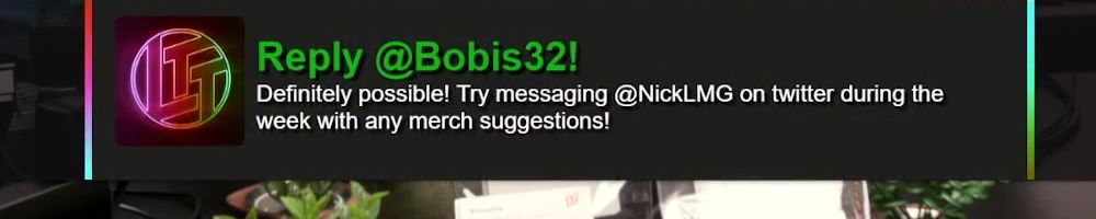 Reply @Bobis32! Definitely possible! Try messaging @NickLMG on twitter during the week with any merch suggestions!