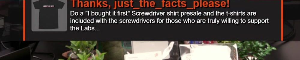Thanks, just_the_facts_please! Do a "I bought it first" Screwdriver shirt presale and the t-shirts are included with the screwdrivers for those who are truly willing to support the Labs...