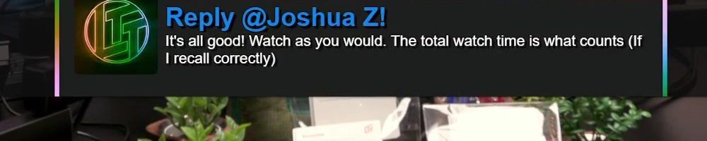 Reply @Joshua Z! It's all good! Watch as you would. The total watch time is what counts (If I recall correctly)