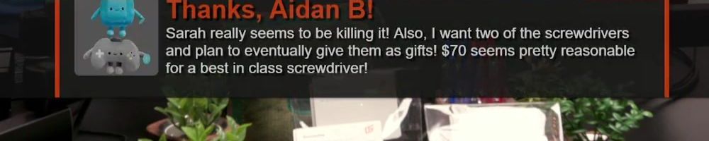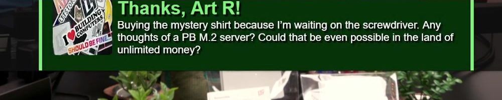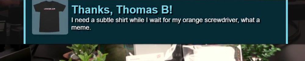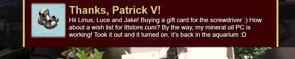 Thanks, Patrick V! Hii Linus, Luce and Jake! Buying a gift card for the screwdriver :) How about a wish list for Ittstore.cum? By the way, my mineral oil PC is working! Took it out and it turned on, it's back in the aquarium :D