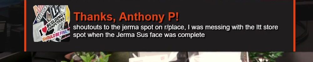 Thanks, Anthony P! shoutouts to the jerma spot on r/place, I was messing with the ltt store spot when the Jerma Sus face was complete