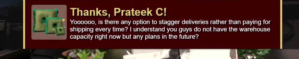 Thanks, Prateek C! Yoooooo, is there any option to stagger deliveries rather than paying for shipping every time? I understand you guys do not have the warehouse capacity right now but any plans in the future?