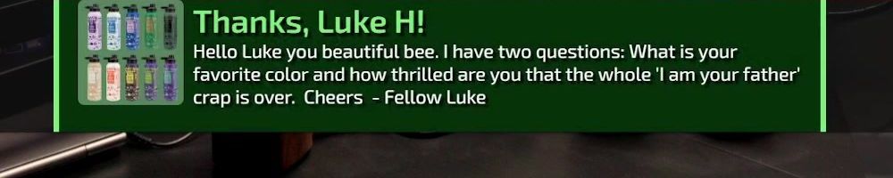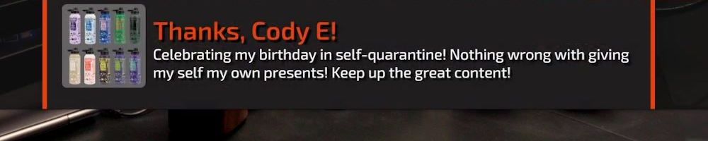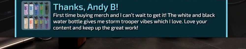 Thanks, Andy B! First time buying merch and I can't wait to get it! The white and black water bottle gives me storm trooper vibes which I love. Love your content and keep up the great work!