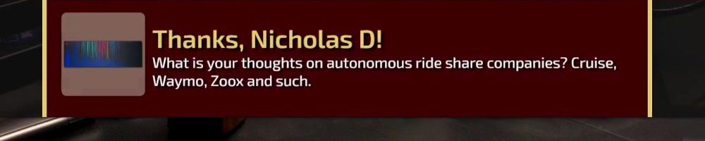 Thanks, Nicholas D! What is your thoughts on autonomous ride share companies? Cruise, Waymo, Zoox and such.