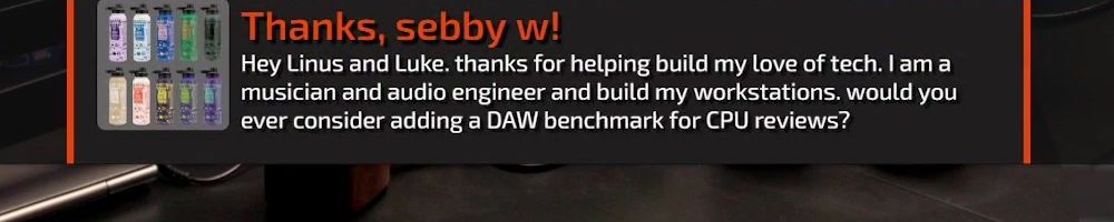 Thanks, sebby w! Hey Linus and Luke. thanks for helping build my love of tech. I am a musician and audio engineer and build my workstations. would you ever consider adding a DAW benchmark for CPU reviews?