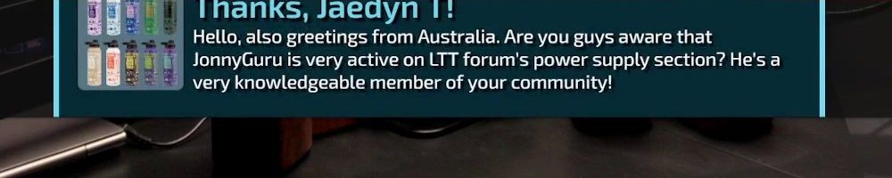 Thanks, Jaedyn I! Hello, also greetings from Australia. Are you guys aware that JonnyGuru is very active on LTT forum's power supply section? He's a very knowledgeable member of your community!
