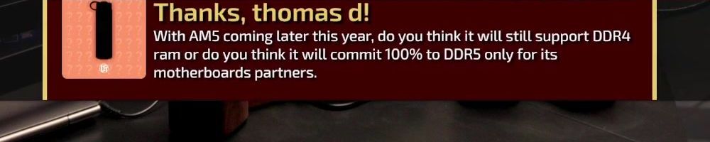 Thanks, thomas d! With AM5 coming later this year, do you think it will still support DDR4 ram or do you think it will commit 100% to DDR5 only for its motherboards partners.