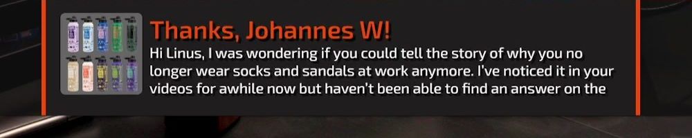 Thanks, Johannes W! Hi Linus, I was wondering if you could tell the story of why you no longer wear socks and sandals at work anymore. I've noticed it in your videos for awhile now but haven't been able to find an answer on the