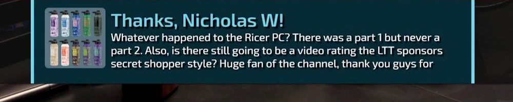 Thanks, Nicholas W! Whatever happened to the Ricer PC? There was a part 1 but never a part 2. Also, is there still going to be a video rating the LTT sponsors secret shopper style? Huge fan of the channel, thank you guys for