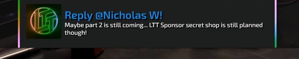Reply @Nicholas W! Maybe part 2 is still coming... LTT Sponsor secret shop is still planned though!