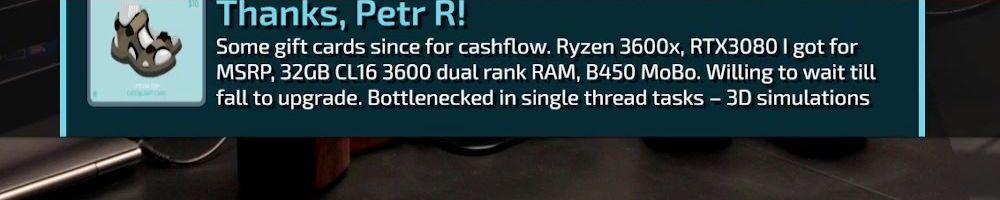 Thanks, Petr R! Some gift cards since for cashflow. Ryzen 3600x, RTX3080 I got for MSRP, 32GB CL16 3600 dual rank RAM, B450 MoBo. Willing to wait till fall to upgrade. Bottlenecked in single thread tasks - 3D simulations