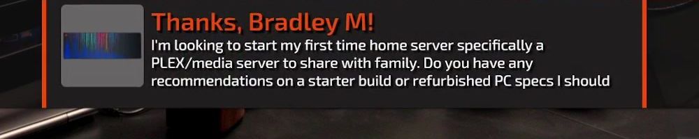 Thanks, Bradley M! I'm looking to start my first time home server specifically a PLEX/media server to share with family. Do you have any recommendations on a starter build or refurbished PC specs I should