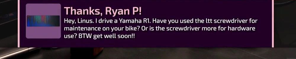 Thanks, Ryan P! Hey, Linus. I drive a Yamaha R1. Have you used the ltt screwdriver for maintenance on your bike? Or is the screwdriver more for hardware use? BTW get well soon!!