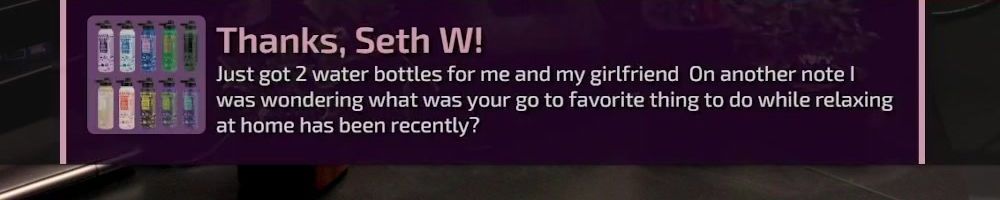 Thanks, Seth W! Just got 2 water bottles for me and my girlfriend On another note I was wondering what was your go to favorite thing to do while relaxing at home has been recently?