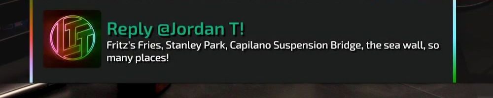 Reply @Jordan T! Fritz's Fries, Stanley Park, Capilano Suspension Bridge, the sea wall, so many places!