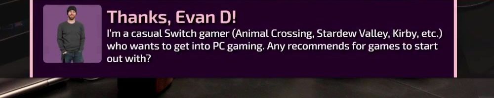 Thanks, Evan D! I'm a casual Switch gamer (Animal Crossing, Stardew Valley, Kirby, etc.) who wants to get into PC gaming. Any recommends for games to start out with?
