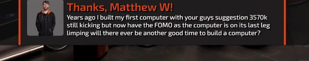 Thanks, Matthew W! Years ago I built my first computer with your guys suggestion 3570k still kicking but now have the FOMO as the computer is on its last leg limping will there ever be another good time to build a computer?
