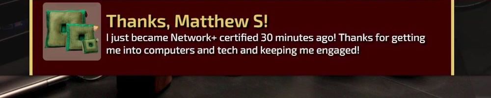 Thanks, Matthew S! I just became Network+ certified 30 minutes ago! Thanks for getting me into computers and tech and keeping me engaged!