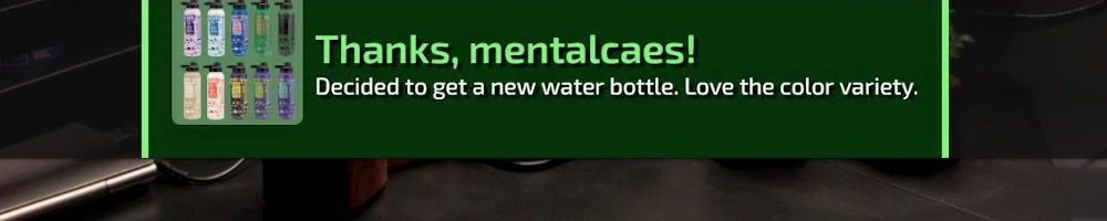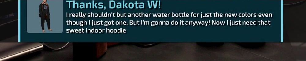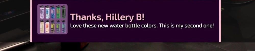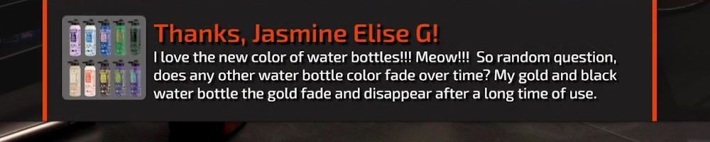 Thanks, Dakota W! I really shouldn't but another water bottle for just the new colors even though I just got one. But I'm gonna do it anyway! Now I just need that sweet indoor hoodie