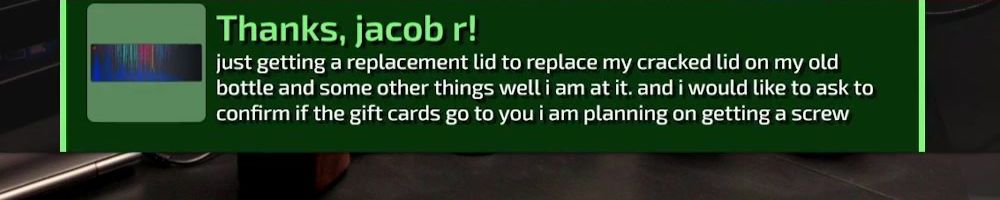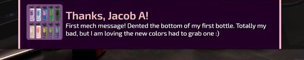 Thanks, Jacob A! First mech message! Dented the bottom of my first bottle. Totally my bad, but I am loving the new colors had to grab one :)