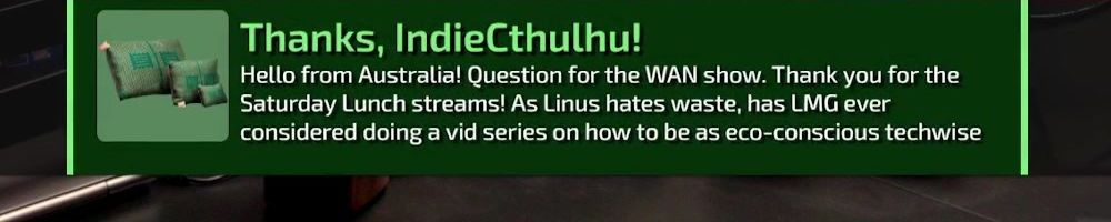 Thanks, IndieCthulhu! Hello from Australia! Question for the WAN show. Thank you for the Saturday Lunch streams! As Linus hates waste, has LMG ever considered doing a vid series on how to be as eco-conscious techwise
