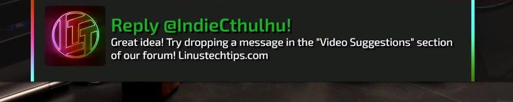 Reply @IndieCthulhu! Great idea! Try dropping a message in the "Video Suggestions" section of our forum! Linustechtips.com