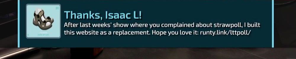 Thanks, Isaac L! After last weeks' show where you complained about strawpoll, I built this website as a replacement. Hope you love it: runty.link/lttpoll/