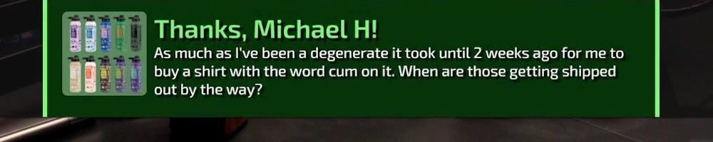 Thanks, Michael H! As much as I've been a degenerate it took until 2 weeks ago for me to buy a shirt with the word cum on it. When are those getting shipped out by the way?
