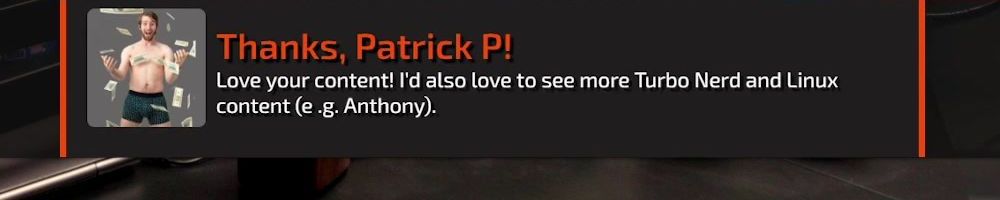 Thanks, Patrick P! Love your content! I'd also love to see more Turbo Nerd and Linux content (e.g. Anthony).