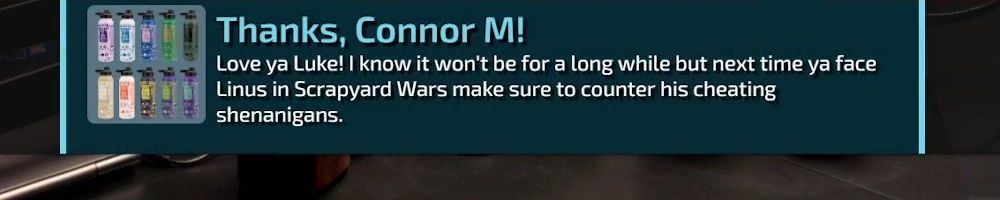 Thanks, Connor M! Love ya Luke! I know it won't be for a long while but next time ya face Linus in Scrapyard Wars make sure to counter his cheating shenanigans.