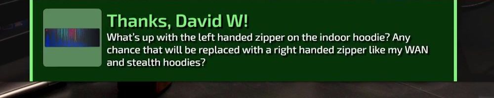 Thanks, David W! What's up with the left handed zipper on the indoor hoodie? Any chance that will be replaced with a right handed zipper like my WAN and stealth hoodies?